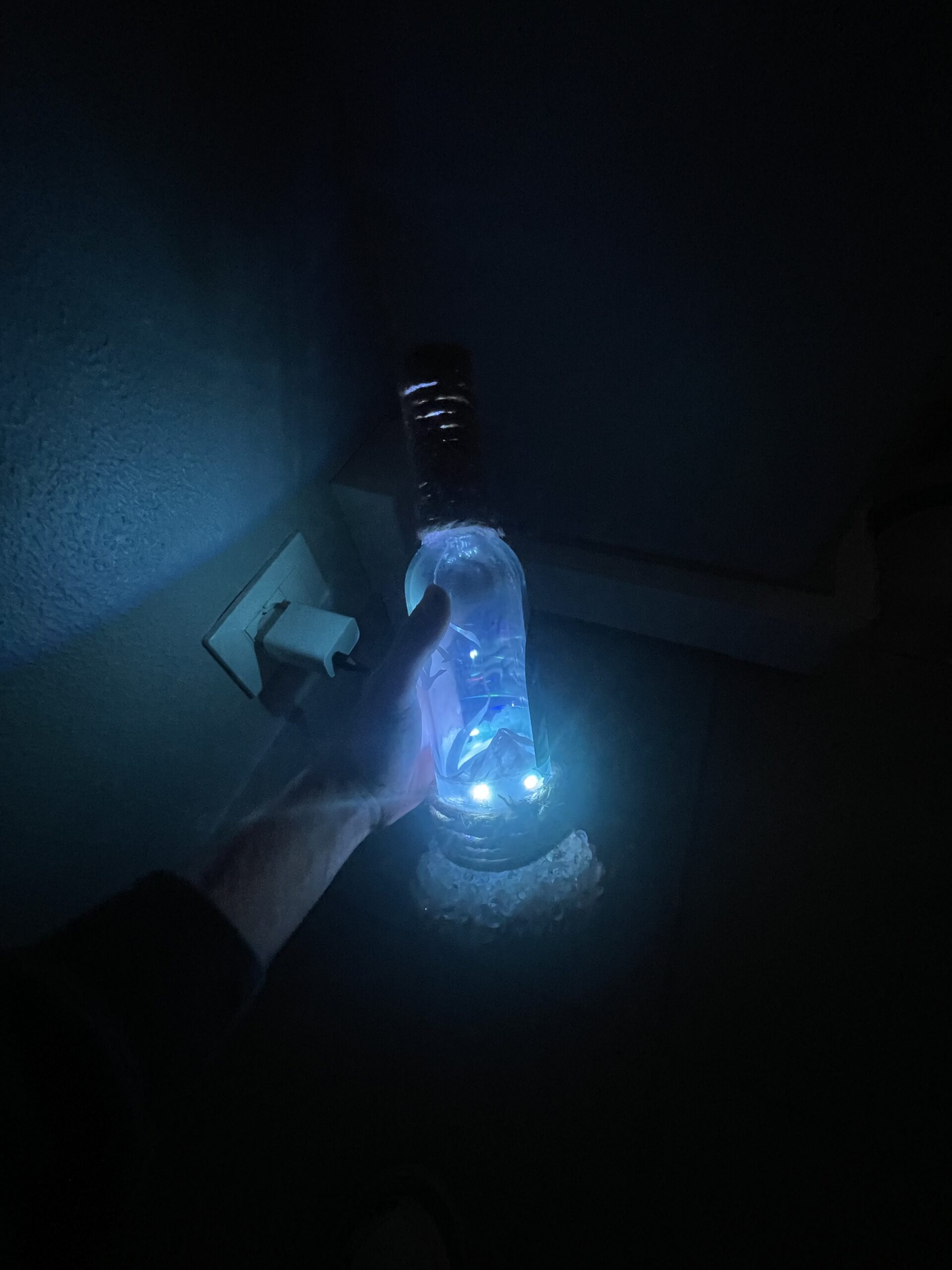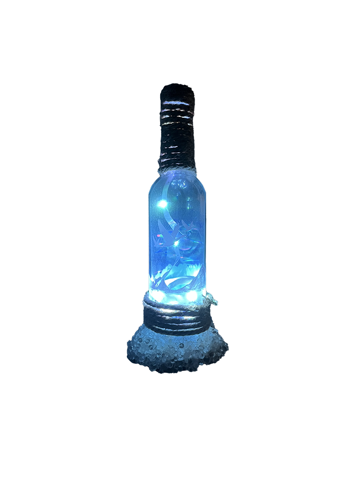 Ubriaka è una lampada di design composta da una bottiglia del noto marchio di Vodka Grey Goose con all’interno una striscia di led avvolta da sabbia sintetica e una grande quantità di diamanti, come base abbiamo utilizzato una fune arrotolata su se stessa e attaccata con la colla a caldo
